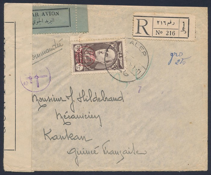 Registered Censored Airmail cover franked President al-Quwatly 200Pi with Lawyers Congress opt, plus 1940 Pic 50c blue (2) on reverse. All tied by 'Alep 11 11 45' cds. To French Guinea with Beyrough & Conakry b/s with censor tape & h/s. SG 344 & 391