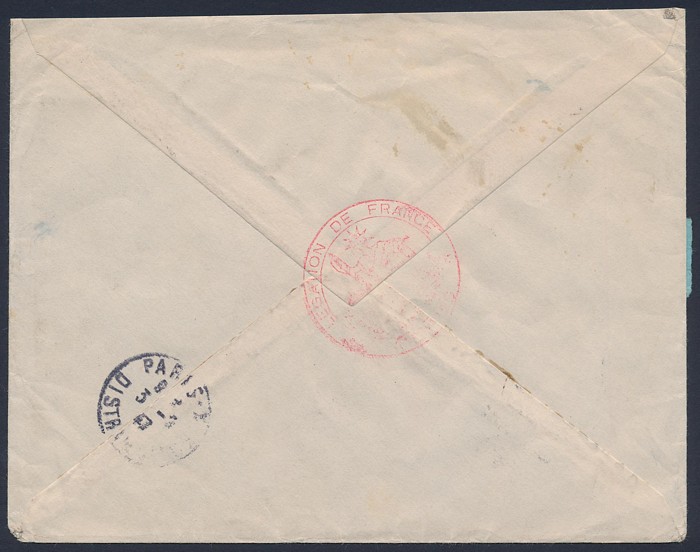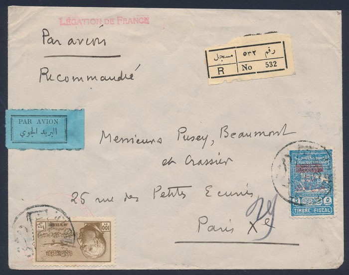Registered Airmail cover from French Legation franked 1945 Government 100Pi brown & Fiscal 5Pi blue opt, tied by 'Damas 20 1 47' cds. SG 408 & T426 cat £46 as loose stamps alone. To Paris with arrival b/s. (Image1) (Image2)