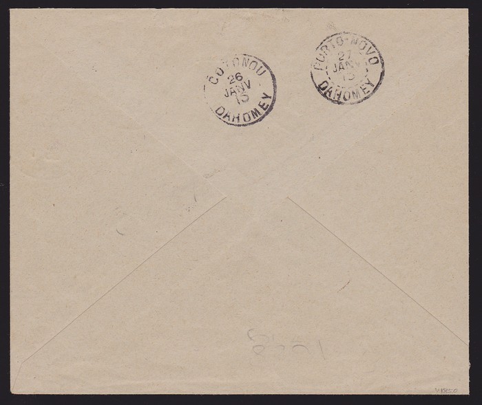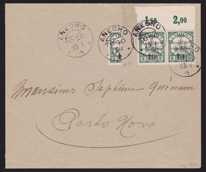 franked thin opt Yacht 10/5pf horiz pr (opt type 1), plus 10/5pf vertical bisect left half (opt type II), tied by 4 strikes 'Anecho Togo 23.1.15' cds, to Dahomey with 'Cotonou 26 Janv 15' & 'Porto-Novo 27 Janv 15' arrival b/s. F-VF fresh. Maury 2II