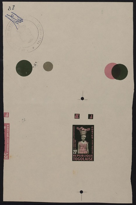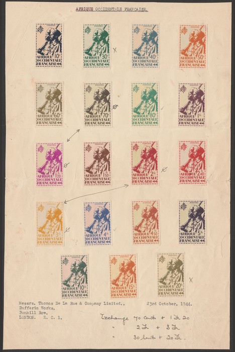 Soldiers set 10c-20Fr, all IMPERF proof colour trials, with 6 stamps being rejected colours. VF UN as made, all 4 margins, mounted on De La Rue archive pg dated 23 October 1944, with notations about exchanging colours of 70c vs 1Fr20, 2Fr vs 3Fr, &