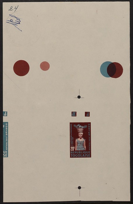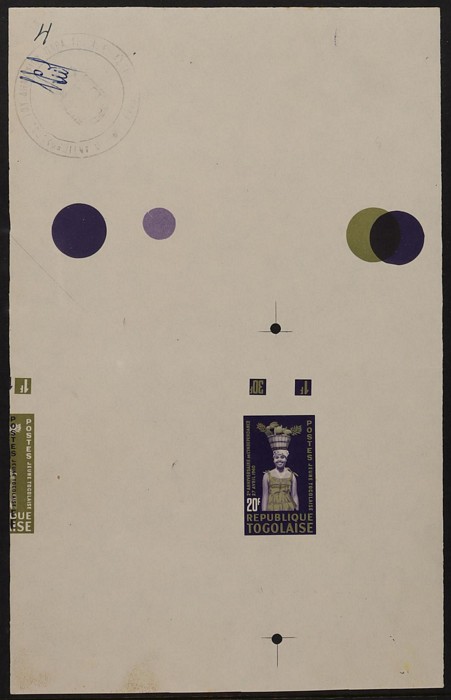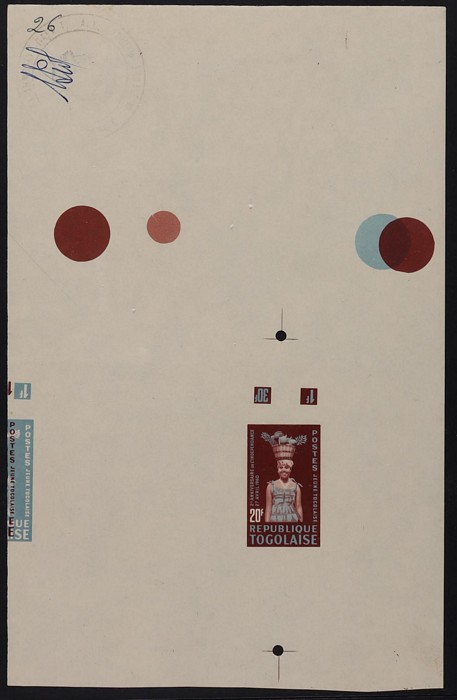 Anniv 20Fr imperf signed colour trials in 3 diff colours plus an additional brown & blue (one without signature). The 3 diff have an additional printer's h/s. VF MNH. SG 306(P). Probably unique group. (4 items) (Image1) (Image2)