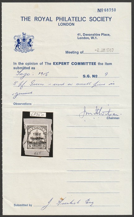cat €8000, Yv 24d, Mi 2H cat €10,000. Very rare provisional usage due to shortage of 5pf stamps at Anecho. We sold a similar bisect cover for $5000+, plus buyers commission in our auction 253. Exp Calves, plus 2013 Ceremuga AIEP photo cert.