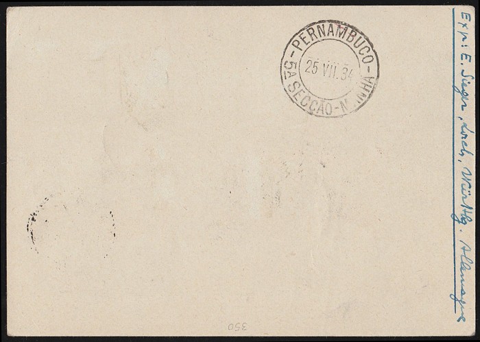 Zeppelin 4th South America flight card franked 5 stamps inc 10Fr black, tied by Tunis cds. To Brazil with Airmail cachet type 'C', Pernambuco arrival b/s. Sieger 260. Rare. (P)