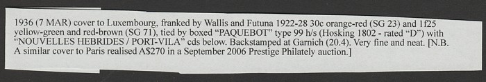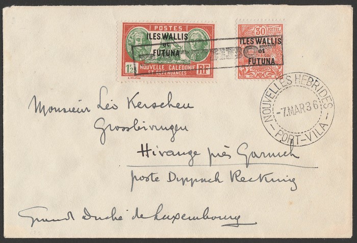 1936 shipmail cover franked Wallis opt New Caledonia 30c orange-red & 1Fr 25 green & brown, tied by boxed 'PAQUEBOT' h/s & Nouvelles Hebrides Port Vila 7 MA 37' cds. To Luxembourg with Carmich arrival b/s. SG 23 & 71 cat £20 as loose stamps