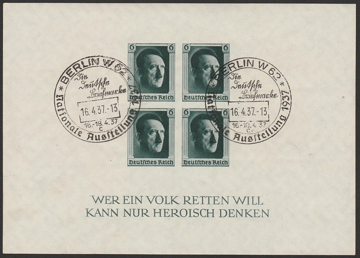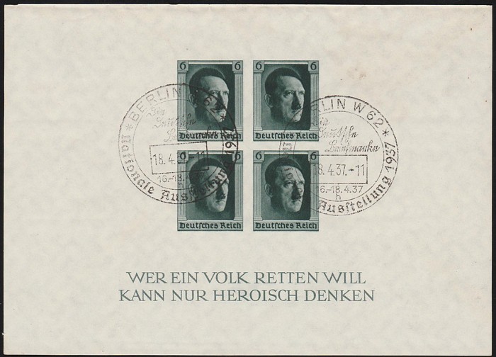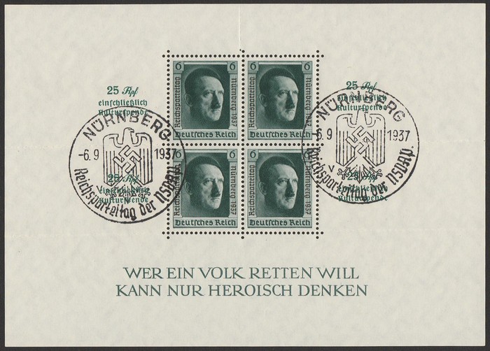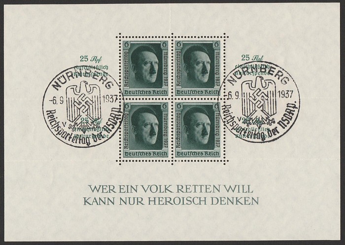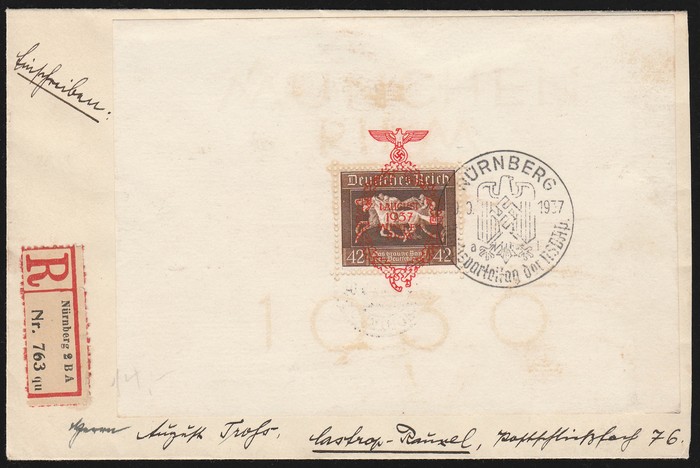 Ribbon M/Sheet on reg cover with 'Nurnberg 10 9 1937' pictorial cds. SG MS637a cat £160 as loose M/S, Mi Blk 10 cat €700 on cover & very scarce thus. (P)