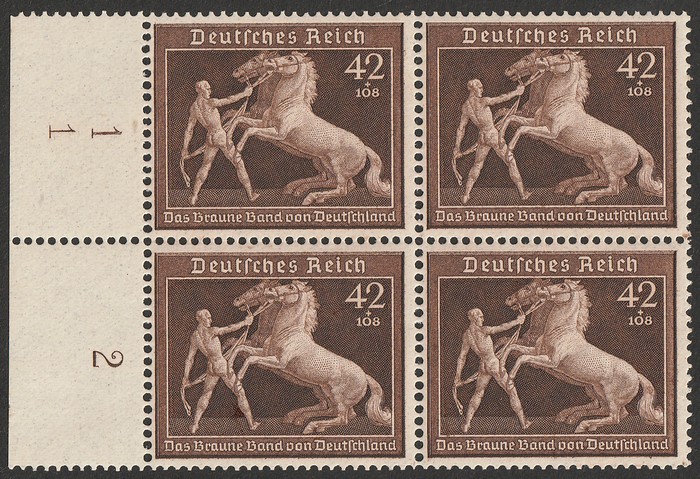 42pf brown left marginal blk of 4. VF MNH. SG 687 cat £400. Mi 747 cat €480 both plus premium for marginal blk. (P) (Image1)