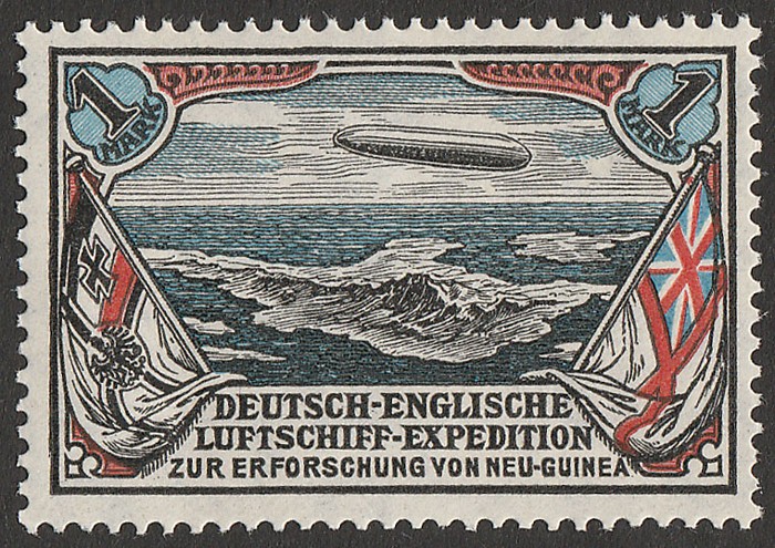 Zeppelin 1Mk black, blue & red, wmk crosses & circles. (Printed by the Imperial German Print Works in Berlin as a fundraising stamp for planned German/British expedition to explore New Guinea, which was cancelled due to the outbreak of war). Superb