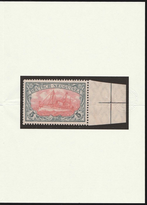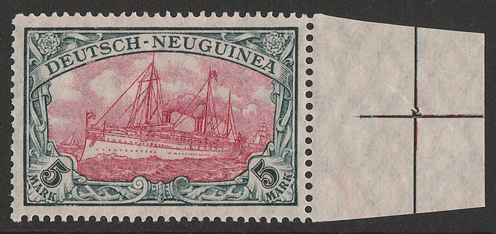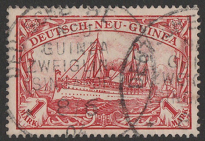 Postmark: 'Deutsche Seepost Neu Guinea Zweiglinie Singapore 8/6 04' cds on Yacht 1Mk, used on the Prinz Waldeau at this date. SG 16 cat £80+. Mi 16 cat €65+ both as loose stamps, plus ArGe cat €125 net value for pmk. Exp Bothe BPP.