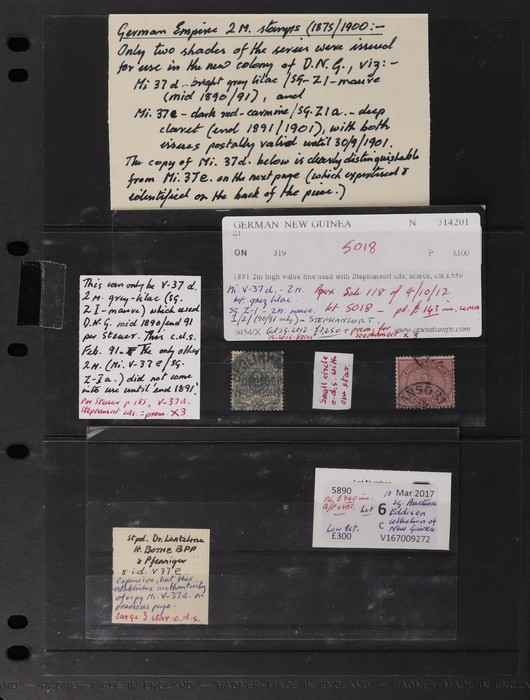 1880s-90s Forerunners of German issues with 1891 Numeral 2Mk (2) both Stephansort cds, 1888 Eagle 50pf rejoined pr with Finschafen 1889 cds, 1890-97 2pf grey CTO Berlinhafen, 5pf green (3) all Friedrichwilhelmshafen cds, 10pf red (2) Herbertshohe &