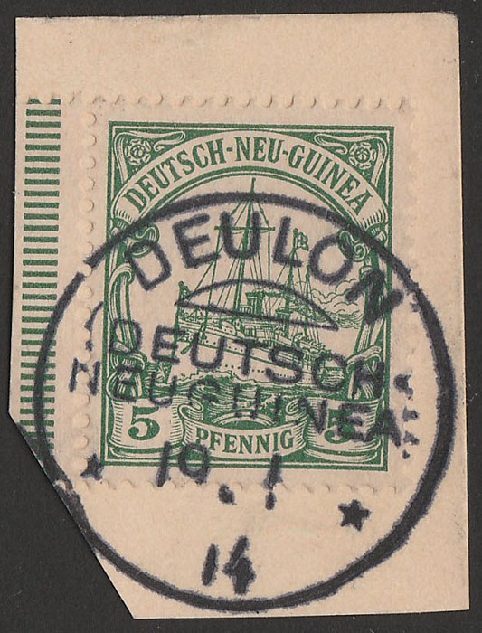 Postmark: 'Deulon DNG 19 1 14' full cds tying Yacht 5pf to piece. Superb U. SG 8. Mi 8. ArGe cat €350+ net value. Beautiful strike of this rare pmk. Exp Bothe BPP. (P)