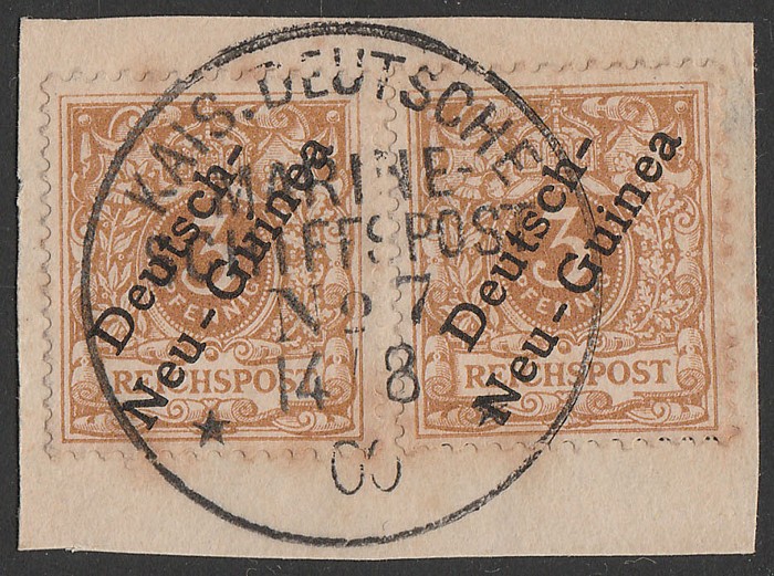 Postmark: 'Kais Deutsche Marine-Schiffspost No 7 14/8 00' full cds tying DNG opt 3pf bistre-brown (hellockerbraun) pr, used on the SMS Mowe I at this date. SG 1 cat £170+. Mi 1b cat €140 both as loose stamp, plus ArGe cat €60 net