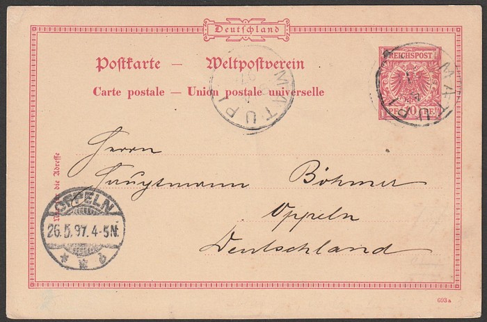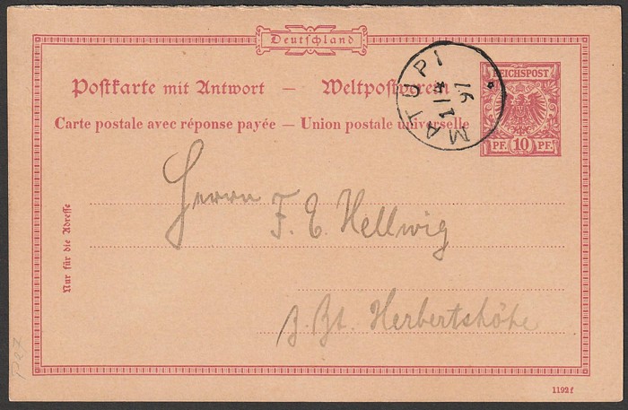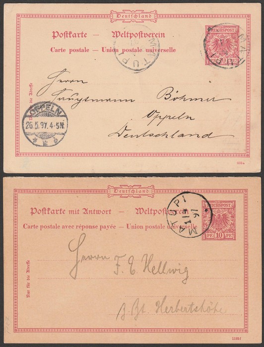 use of Eagle w/o opt 10pf red Postcard, plus reply half of double card with 'Matupi 5/4 97' or '1/4 97' cds. To Germany or Herbertshohe -last with short message. Mi VU13 & VP23 or VP27 cat €250+. (2) (Image1) (Image2)