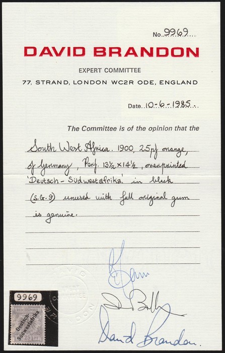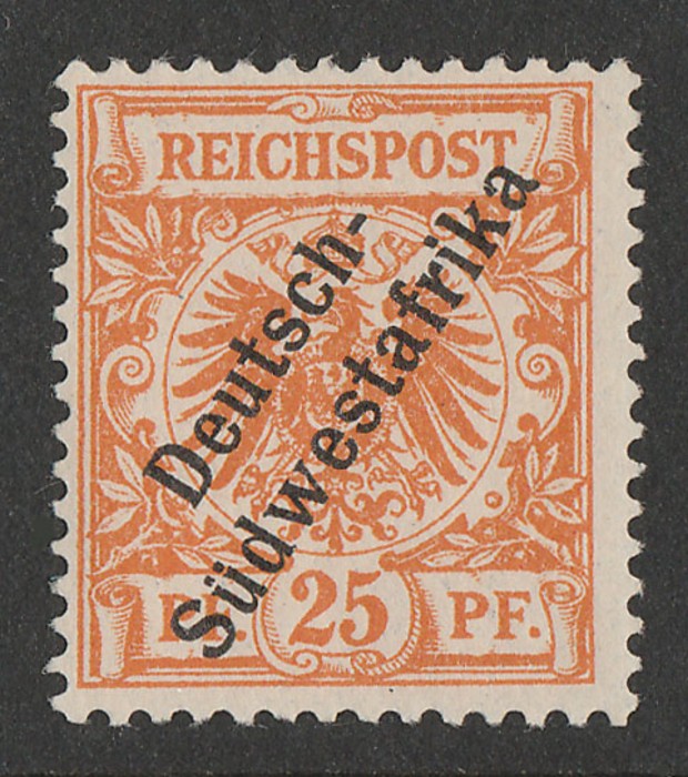 1898-1900 single hyphen opt 25pf orange. VF fresh MNH. SG 9 cat £500 for M, should be at least double, £1000 MNH. Mi 9a cat €1200. Brandon photo cert. (P)