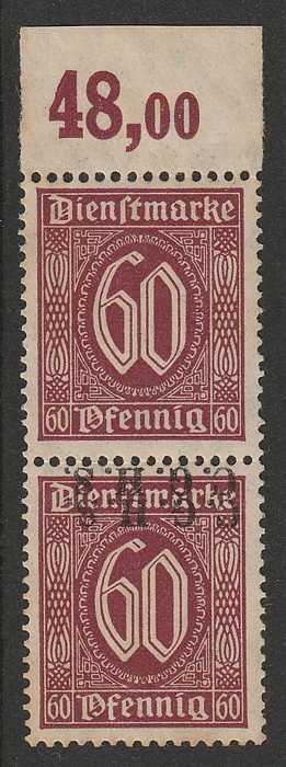 CGHS opt on 2nd Official 60pf lilac, top marginal vert pr, upper stamp opt OMITTED, lower stamp opt double & inverted. VF M/MNH, gum sl tropicalised. Mi D15X(var) + Germany Mi D66, mentioned in footnote but unpriced. Extremely rare! (P) (Image1)