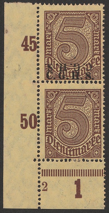 CGHS opt on 2nd Official 5Mk brown/yellow LL cnr marginal vert pr, upper stamp opt double, 1 inverted & lower stamp opt OMITTED. VF M/MLH, gum sl tropicalised. Mi D20XII(var) + Germany Mi D33, mentioned in footnote but unpriced. Extremely rare! (P) (Image1)