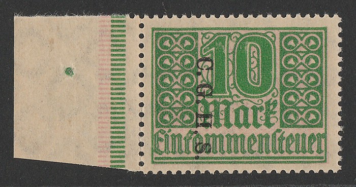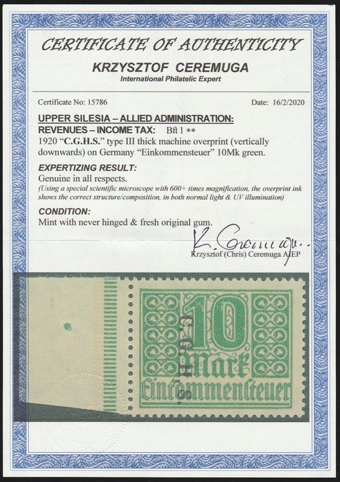 'C.G.H.S.' opt on Germany Income Tax 10Mk revenue, opt vert reading down. Superb fresh MNH. Bft 1. Rare so nice. 2020 Ceremuga AIEP photo cert. (P) (Image1) (Image2)