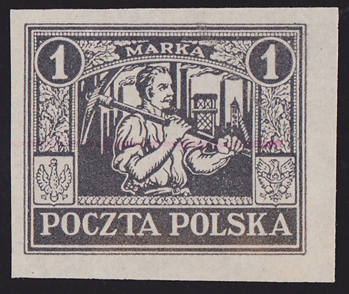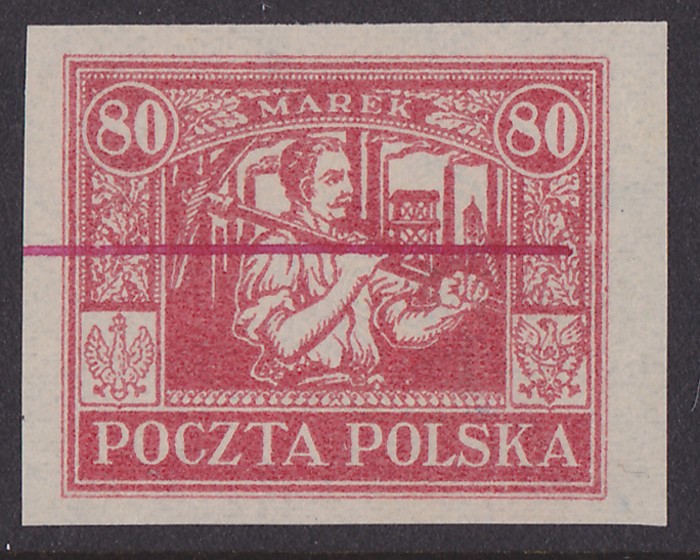 Polish Miner 80Mk red IMPERF PROOF, with unusual printer's security line. VF UN, as made, 4 margins. SG 195(p), Mi 17PU cat €300. Very rare! Exp Schmutz & 2014 Ceremuga AIEP photo cert. (P) (Image1)