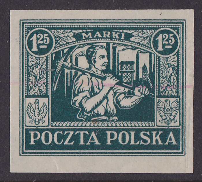 Polish Miner 1.25Mk deep green IMPERF PROOF with usual printer's security line. VF UN, as made, 4 margins. SG 186(p), Mi 8PU cat €100. Very rare!. Exp Schmutz.