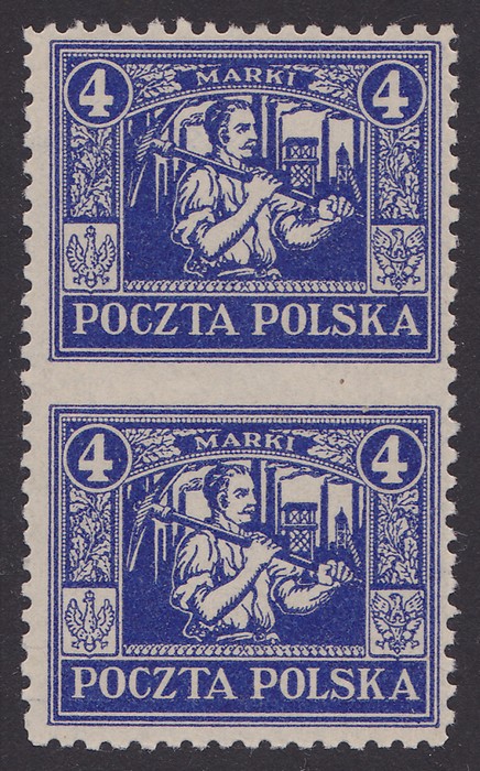Polish Miner 4Mk deep ultramarine, vert pr error IMPERF horiz between. VF fresh MNH. SG 189(var), Mi 11(var) both unlisted. Great rarity. 2014 Ceremuga AIEP photo cert. (P)