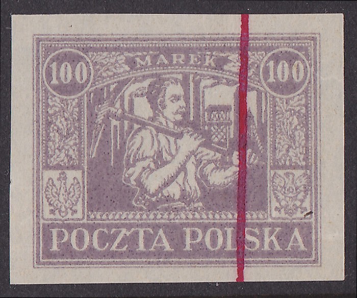 Polish Miner 100Mk bright violet IMPERF PROOF, with usual printer's security line. VF UN, as made, 4 margins. SG 196(p), Mi 18PU cat €300. Very rare! 2014 Ceremuga AIEP photo cert. (P) (Image1)