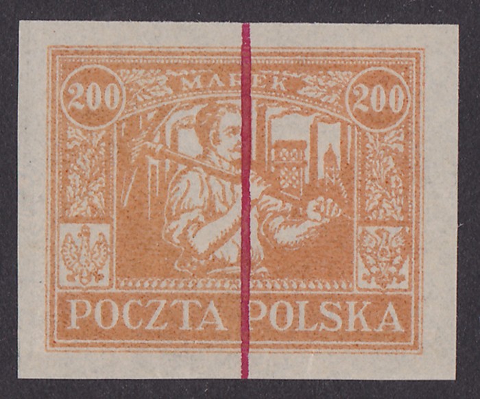 Polish Miner 200Mk dull orange IMPERF PROOF, with usual printer's security line. VF UN, as made, 4 margins. SG 197(p), Mi 19PU cat €300. Very rare! Exp Schmutz & 2014 Ceremuga AIEP photo cert. (P) (Image1)