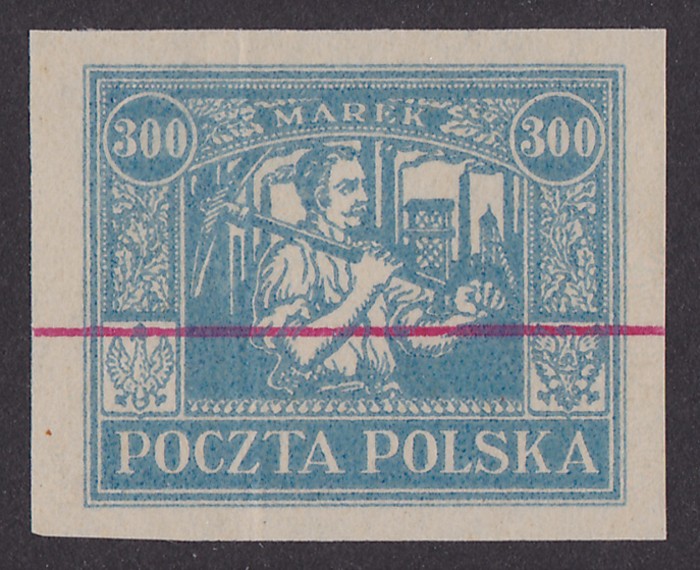 Polish Miner 300Mk pale blue IMPERF PROOF, with usual printer's security line. VF UN, as made, 4 margins. SG 198(p), Mi 20PU cat €300. Very rare! Exp Schmutz & 2014 Ceremuga AIEP photo cert. (P) (Image1)