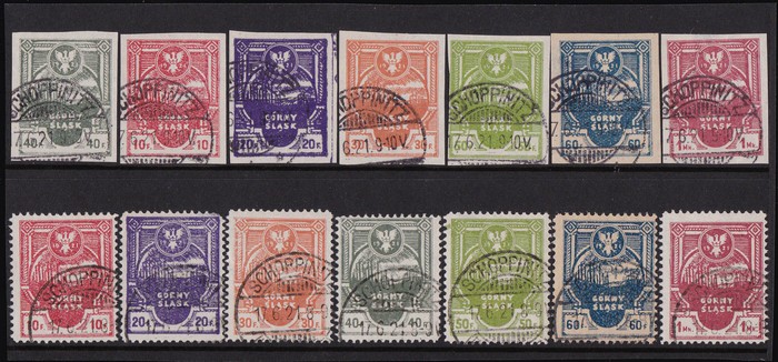 Polish Uprising issue sets 10f-1Mk, both perf & imperf. Mostly VFU, all with clear 'Schoppinitz / 17.6.21' cds. Mi 1-7A & B cat €1180+. Very rare in used condition. (14) (P)