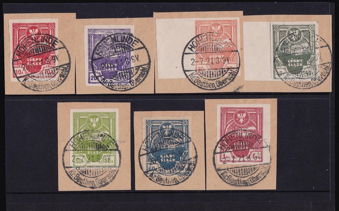 Polish Uprising issue set 10f-1Mk imperf. Superb U, ea tied to piece by 'Hohenlinde 1921' cds. Mi 1-7B cat €400++. Rare so nice used. 2017 Ceremuga AIEP photo cert. (7). (P)