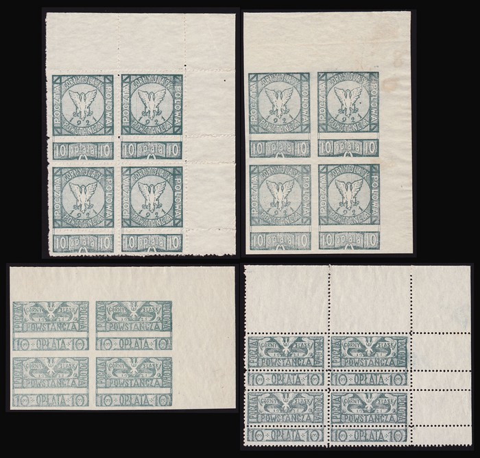 Polish Rebel 'Green Post' set 10pf Eagle horiz & vert format, both perf & imperf, all in cnr blks of 4. F-VF UN as made. Mi 1-2A & B cat €880+ as UN. Very rare in blks! Exp Ceremuga AIEP. (4 blks) (P) (Image1)