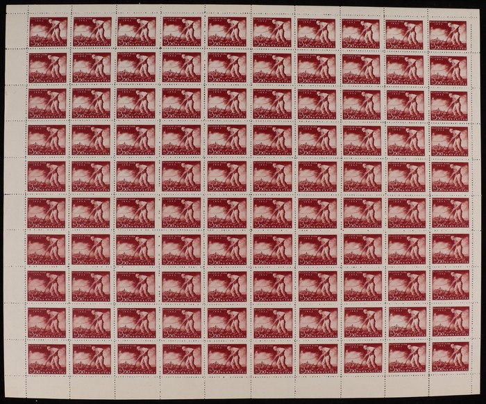 Labour Day 3K50 red-brown full sheet of 100 with 'bird' variety (pos 65 & 68). VF fresh MNH. Mi 178 cat €100+. SG 149 cat £110 for M singles, should at least double, £220 MNH, plus premium for variety sheet. (Image1) (Image2)