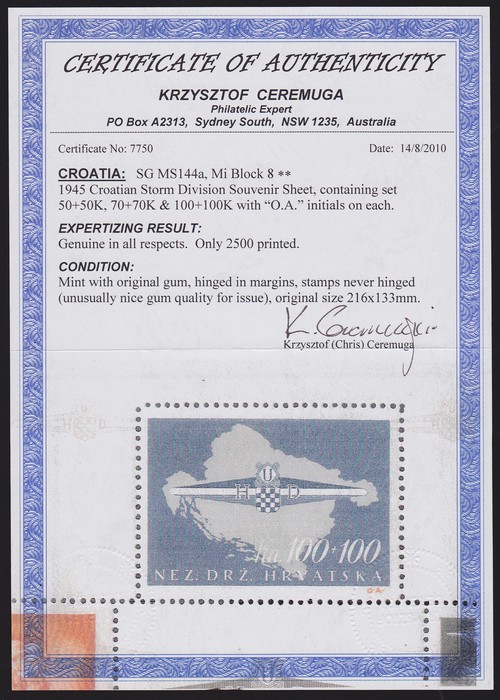cat €2200+, SG MS144a cat £2000 for M, should be at least double, £4000 MNH. Genuine perfect condition examples of this M/S are very seldom offered - beware of the very dangerous reprints that exist! 1996 APS & 2010 Ceremuga photo