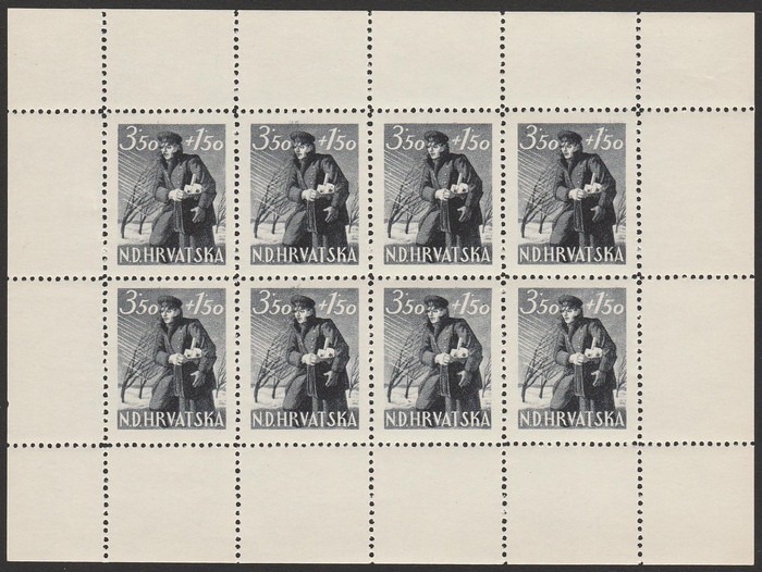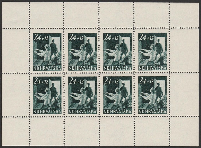 Zagreb Anniv 3.50K sheetlet of 8, 1944 Post & Rail Employees Relief set 7+3.50 - 32+165 sheetlets of 9, War Invalid Relief set 7-3.50K - 32+16K sheetlets of 8, plus central label. VF fresh MNH. Mi 97KLB & 150-57KLB cat €140. SG77 & 123-30 cat
