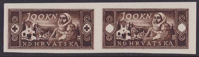 Cross 100k brown 'Mother & Child & Burnt Village' unissued due to defeat of Croatia, IMPERF horiz pr on normal paper, right stamp cross omitted. Super fresh MNH. Scarce. (P)