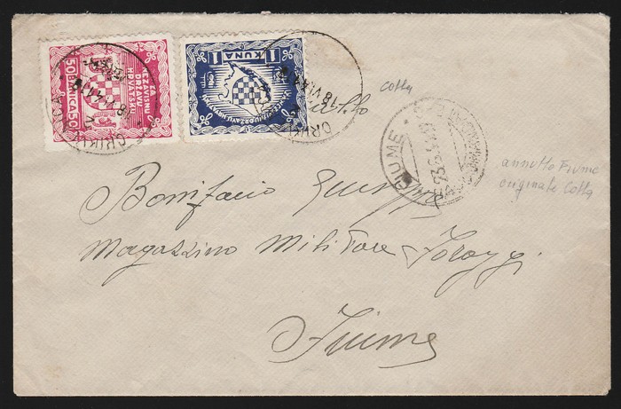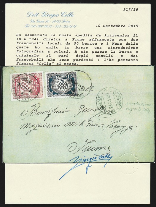with provisional usage of Ustasha propaganda stamps 50b red & 1K blue (instead of normal postage stamps!), tied by 'Crikvenica / 18.VI.41' cds, used to Italy with 'Fiume 23.6.41' arrival cds on front, plus also a stampless cover with 'Crikvenica /
