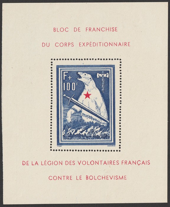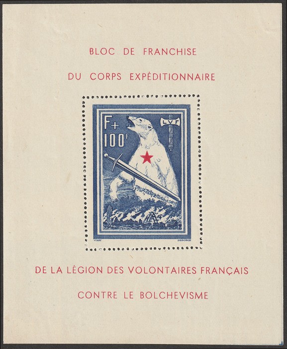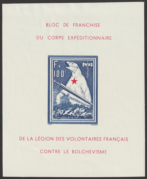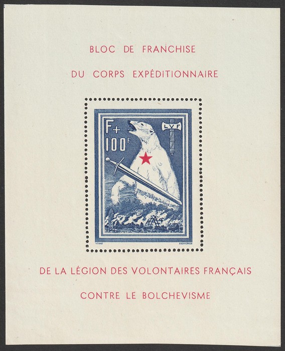 1941 French Legion on Eastern Front 100Fr M/sheet showing Russian Bear & town in flames, variety 'small blue line above design' VF fresh MNH, never hinged original gum. Maury Blk 1(var). Mi Blk IPFI €1200. 2024 Ceremuga photo cert. (P) (Image1)