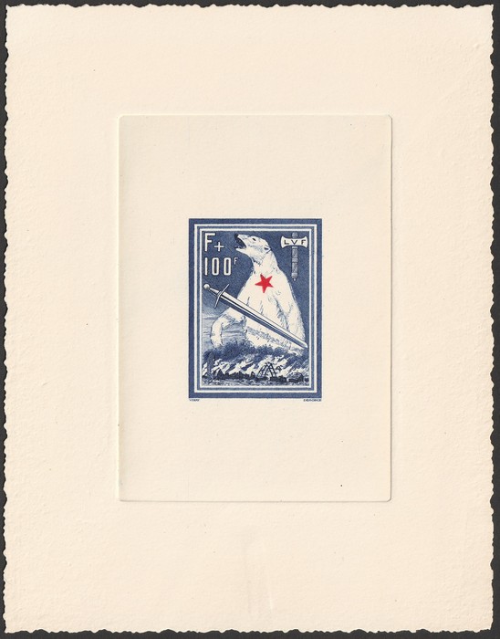 1941 French Legion on Eastern Front 100Fr M/Sheet showing Russian Bear & town in flames, epreuvre de luxe IMPERF die proof on card with deckled edges. Superb fresh UN as made. Maury Bloc 1EL. Mi Blk 1M cat €4000. Extremely rare. 2024 Ceremuga