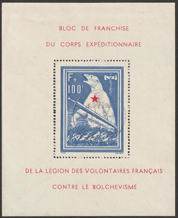 1941 French Legion on Eastern Front 100Fr M/Sheet showing Russian Bear & town in flames. VFU/CTO with German 'Feldpost 16.3.42' cds. Maury Blk 1 cat €650. Mi Blk I cat €800+. Very rare with genuine cds. 2024 Ceremuga photo cert. (P) (Image1)