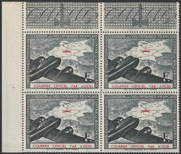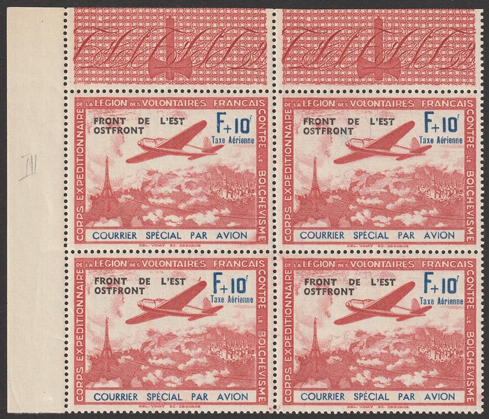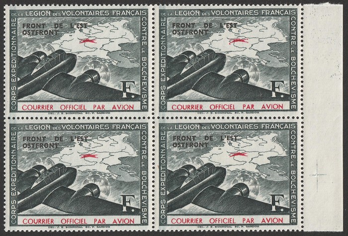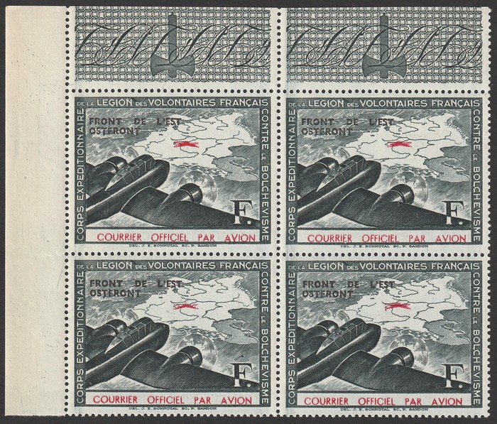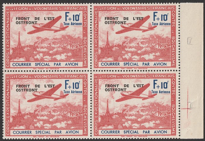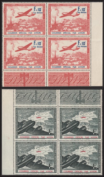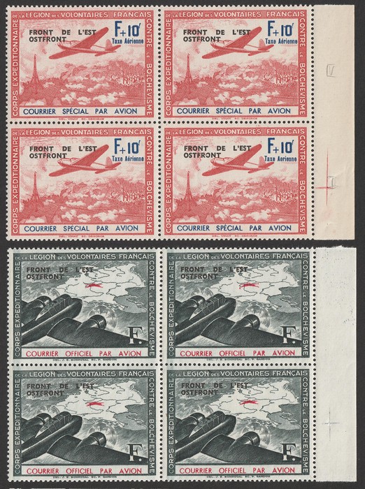 1942 French Legion on Eastern Front set Airmail F(+10F) green & red, & F+10 red & blue with OSTFRONT opts both in UL cnr blks of 4, 2nd with variety 'F broken base' (pos 1). VF fresh MNH. Maury 4-5(var). Mi IV-V inc VPF III cat €400+, plus