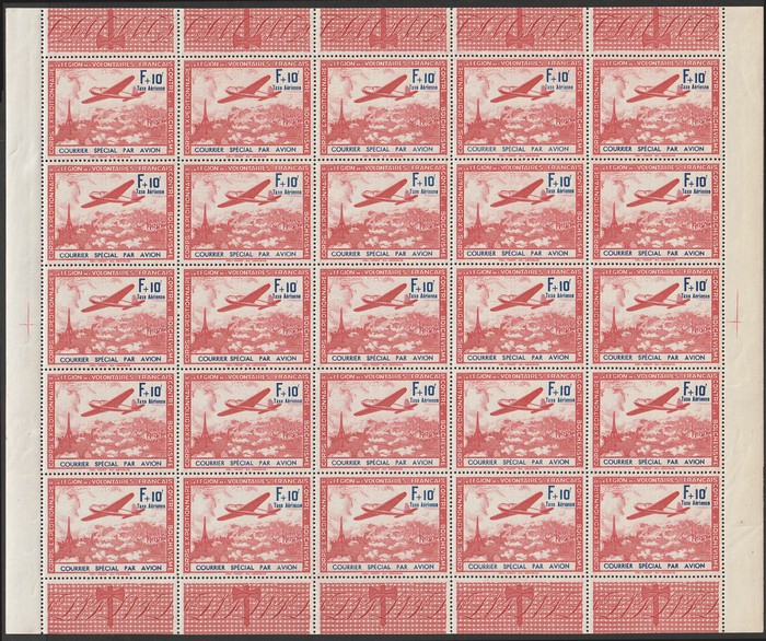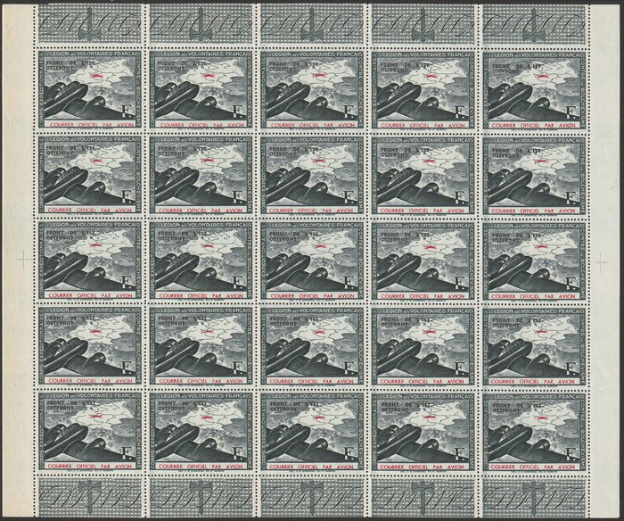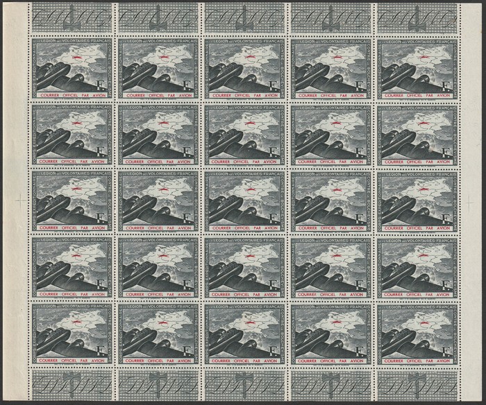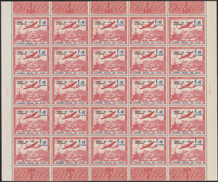 1941 French Legion on Eastern Front set Airmail F (+10F) green & red & F+10 red & blue with OSTFRONT opts in full sheets of 30, with annotated varieties on the red sheet with 'F broken at base' (pos 1), 'N of Avion broken at top '(pos 10), 'missing