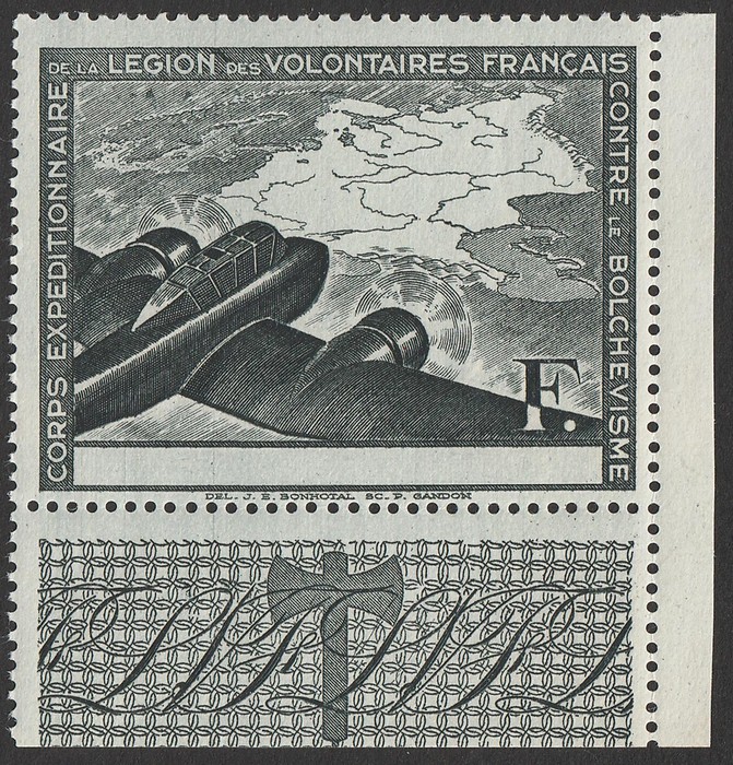 1941 French Legion on Eastern Front Airmail F (+10F) green & red, error red shifted down so at top margin of stamps & with blank tablet at base. Superb fresh MNH. Maury 2c cat €135+. Mi IIF(var) cat €200 for missing red. Rare. 2024 Ceremuga