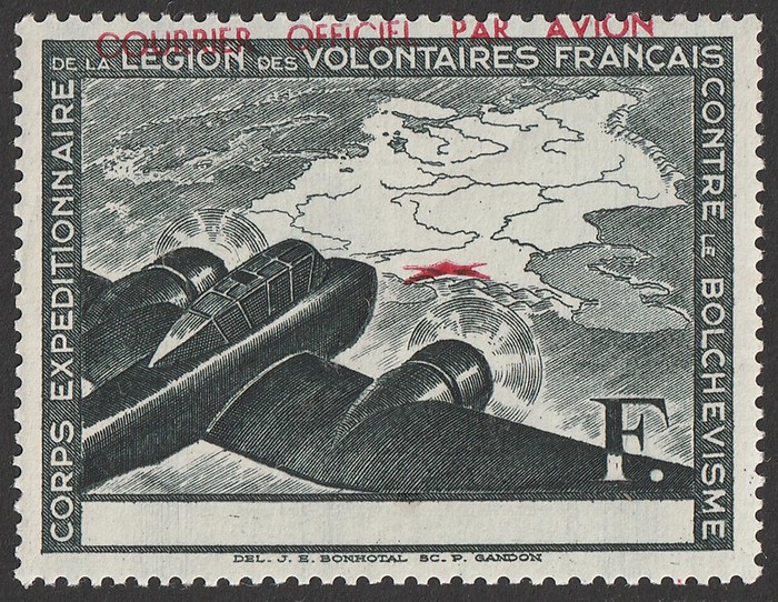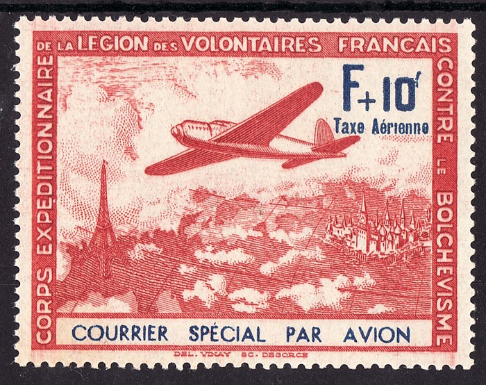 1941 French Legion on Eastern Front Airmail F+10 red & blue, variety missing dot on Aerienne. VF fresh MNH. Maury 3(var). Mi IIIPFII cat €120. (Image1)