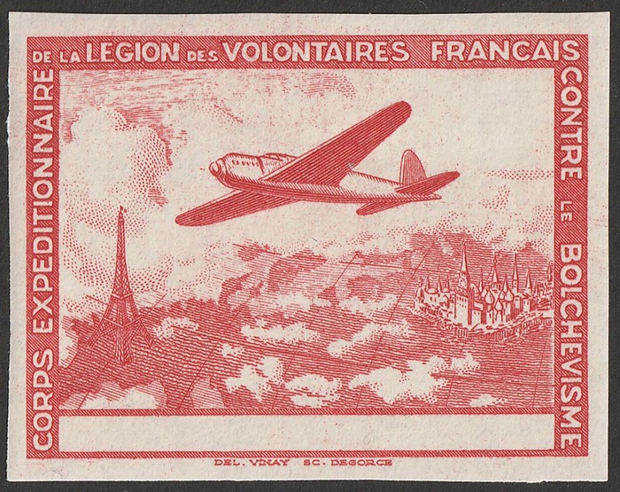 1941 French Legion on Eastern Front Airmail F+10 red & blue, IMPERF & blue OMITTED so blank table at base. Superb fresh MNH. Maury 3a cat €325. Mi III FU cat €300. Rare. 2024 Ceremuga photo cert. (P) (Image1)
