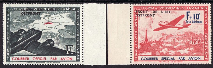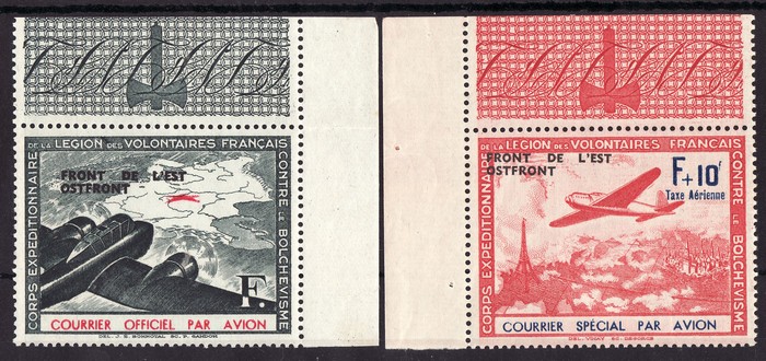 1942 French Legion on Eastern Front set Airmail F (+10F) green & red, & F+10 red & blue, both UL cnr marginal, last with variety 'F' broken at base (pos1). VF fresh MNH. Maury 4&5(var) cat €44, plus premium for variety Mi IV & VPFIII cat
