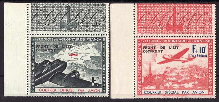 1942 French Legion on Eastern Front set Airmail F (+10F) green & red, & F+10 red & blue with OSTFRONT opts shifted, 1st up & right, 2nd up & left. VF fresh MNH. Maury 4g & 5g cat €220. Mi IV(var) - V(var) cat €800++ as normals, plus premium