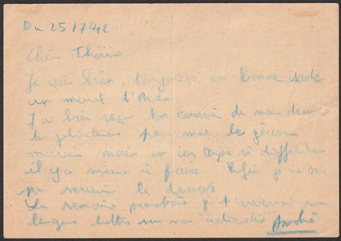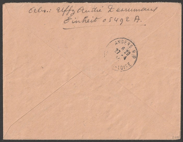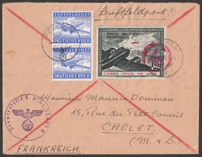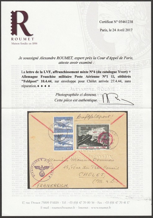 Infantry Regiment 638) to France, with 'Angers RP 27-4 44' b/s. Maury 4 cat €775++. Mi IV. Extremely rare genuine airmail usage from the Eastern front. 2017 Roumet photo-cert. (P) (Image1) (Image2)