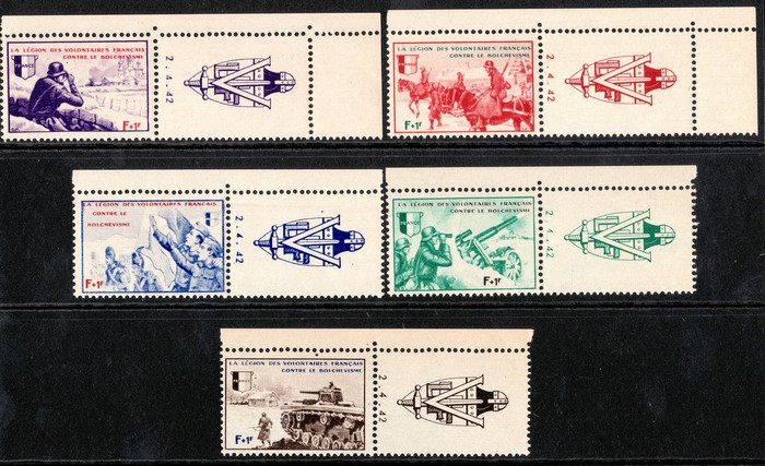 1942 French Legion on the Eastern Front battle scenes set F-1F with printed tabs. Issued by French Legion Against Bolshevism. VF fresh MNH. Maury 6-10(var). Mi VI-XZfBr cat €200. (5). (Image1)