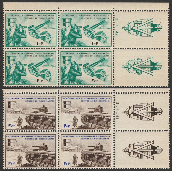 1942 French Legion on the Eastern Front battle scenes F+1F with printed tabs. Issued by French Legion Against Bolshevism. Blks of 4 with dated & undated pictorial tabs. VF fresh MNH. Maury 6-10. Mi VI-XZfBr cat €800. (5 blks) (P) (Image1) (Image2)