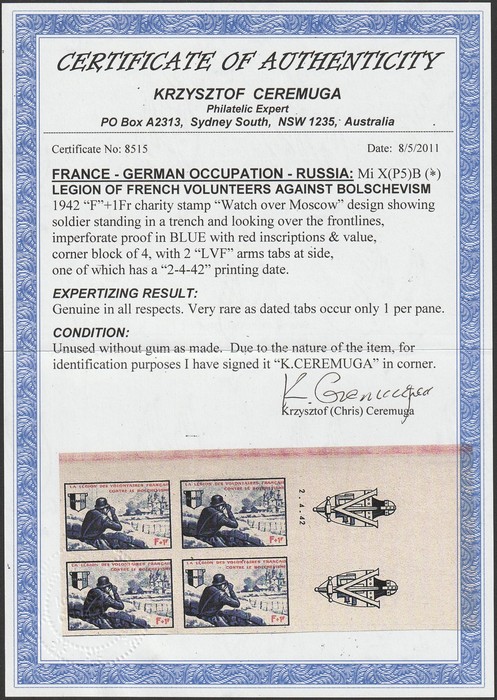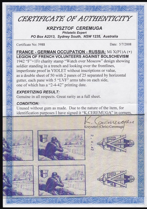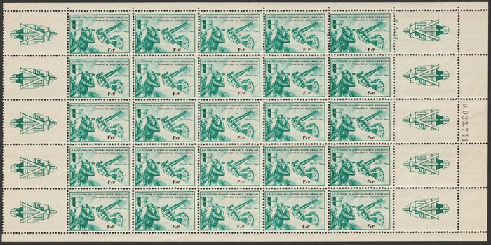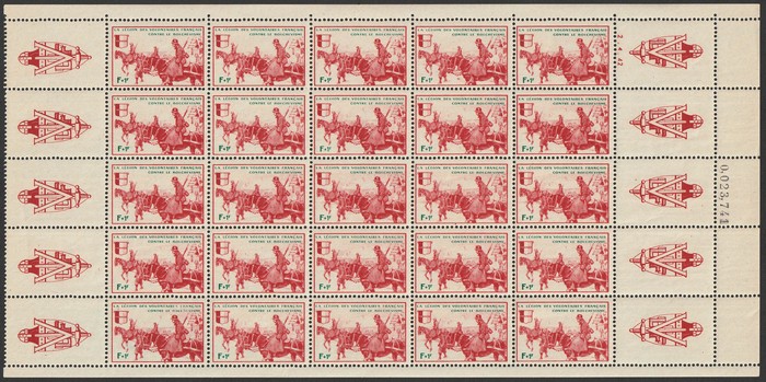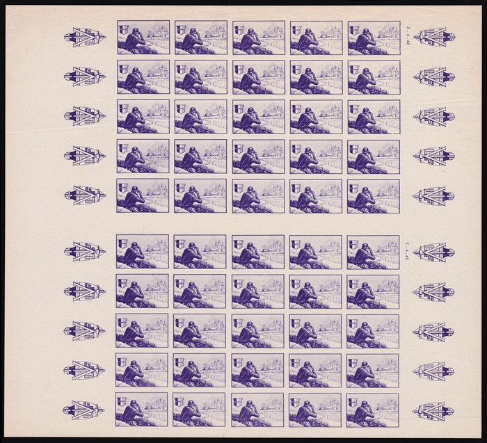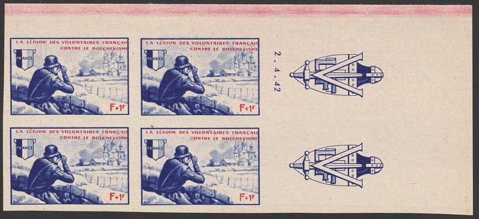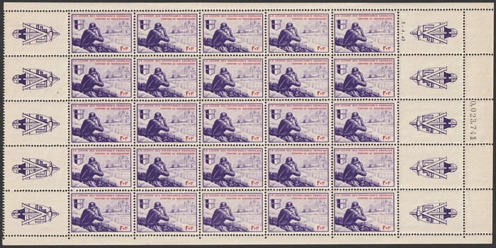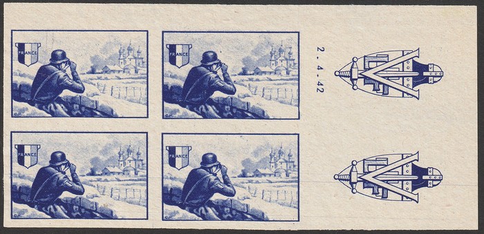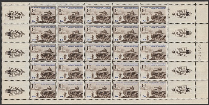 1942 French Legion on the Eastern Front battle scenes F+1F with printed tabs. Issued by French Legion Against Bolshevism. Full sheets of 25 with pictorial margin tabs & 1 tab per pane dated '2 4 42' & ea pane with h/s serial number. VF fresh MNH.
