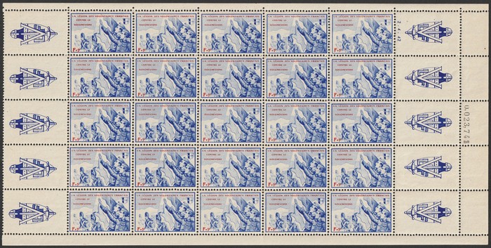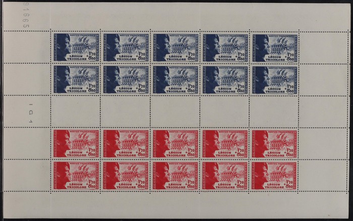 Tricolour Legion in Russia full sheet of 25 with 2 rows 1Fr20+ 8Fr80 blue, 1 row of albino impressions & 2 rows of 1Fr20+8Fr80 scarlet, with printer sheet no margin. VF fresh MNH. SG 769-70 cat £165 as M singles, so £330+ MNH. Maury 566B