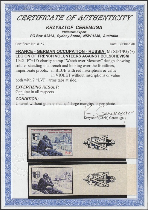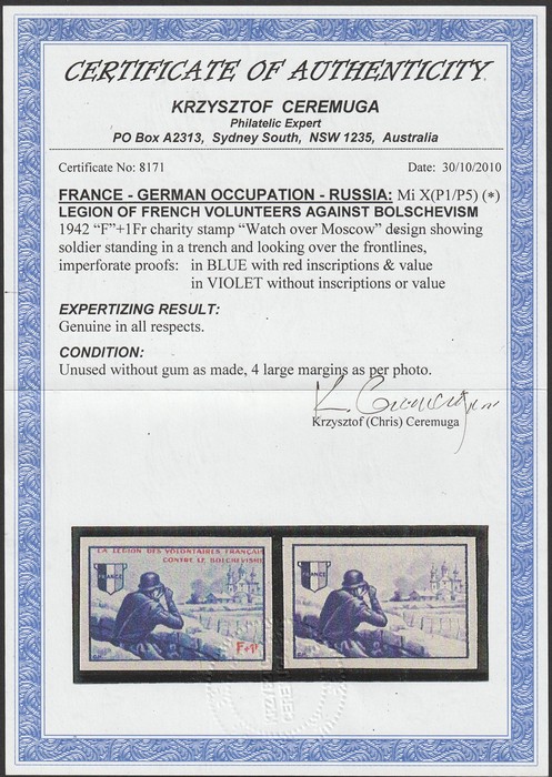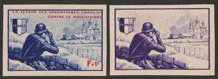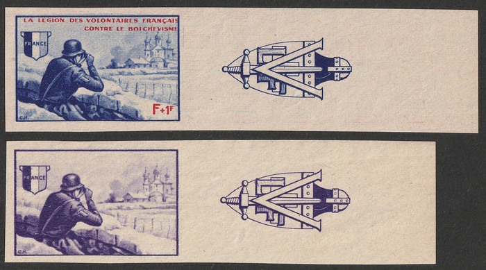 1942 French Legion on the Eastern Front battle scenes F+1F charity stamps with Watch over Moscow design of soldier looking over the front lines imperf proofs in blue with red text & in violet w/o text. VF fresh UN as made. Maury 10(var) cat